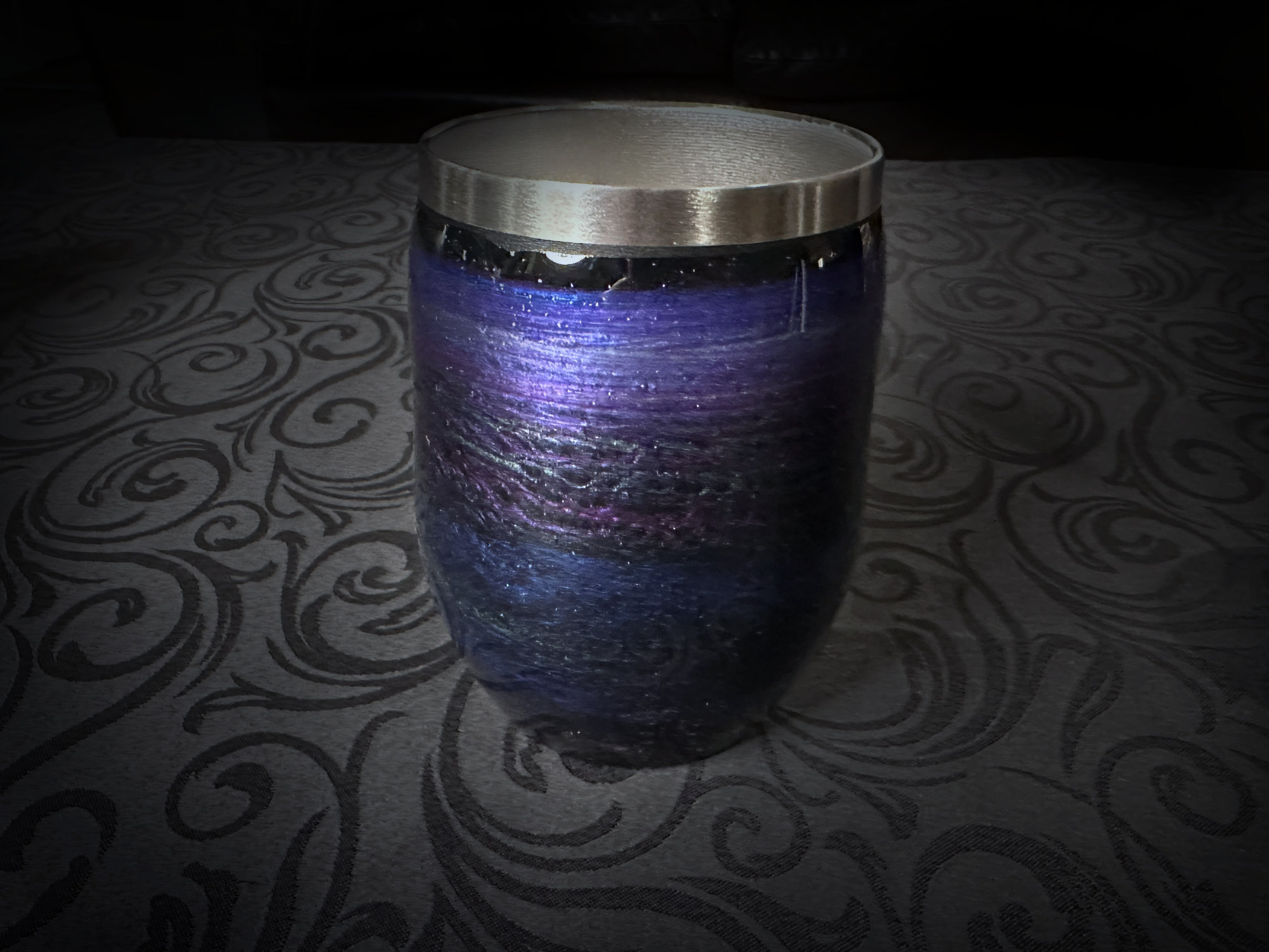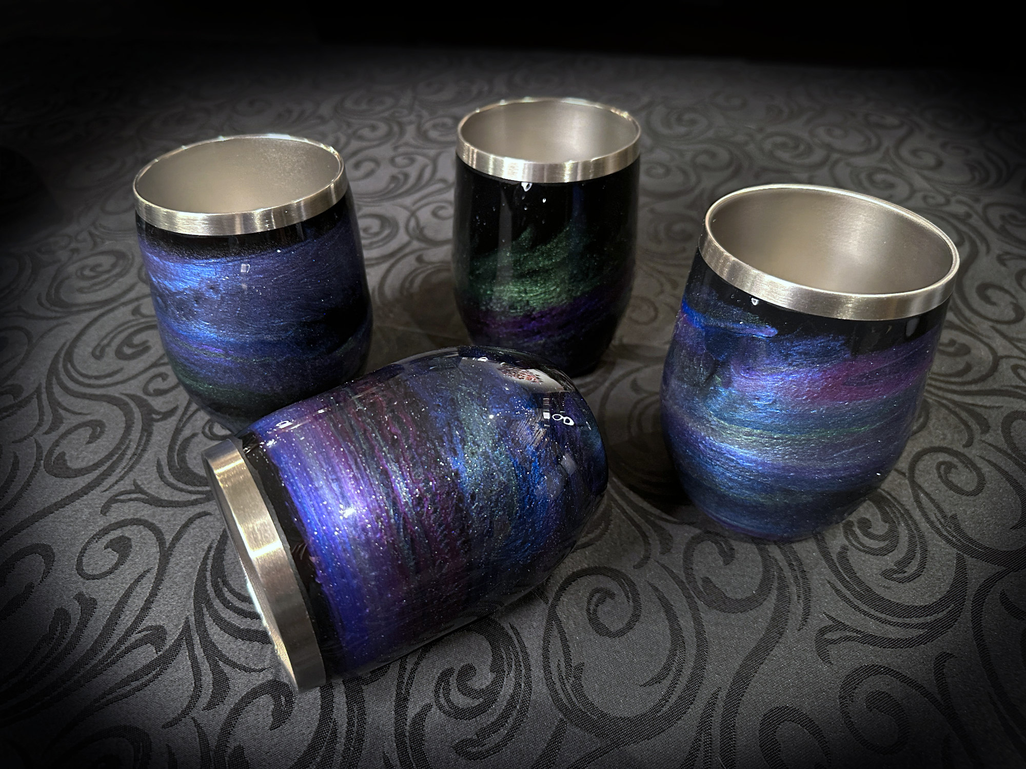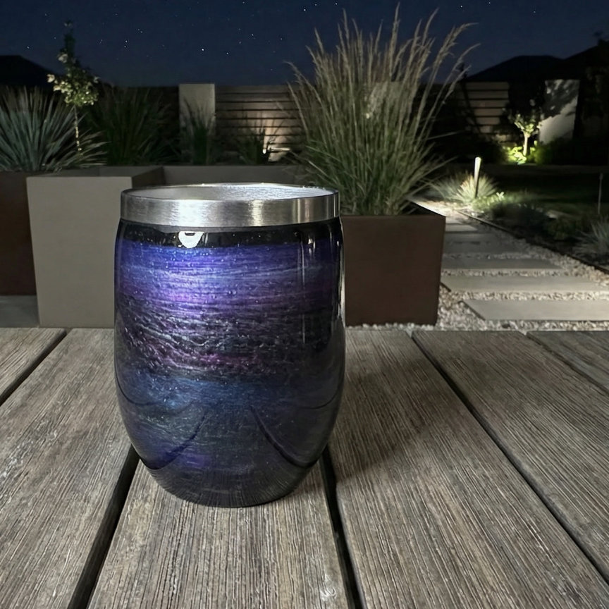 Made for people who love a little wonder in the everyday, this tumbler brings the northern sky straight into your hands. Deep blues, greens, and violets swirl in soft, luminous layers — a shifting, cosmic glow that feels alive in the light. Each piece is hand-poured, so no two are ever the same, giving you a small, personal night-sky to take anywhere.