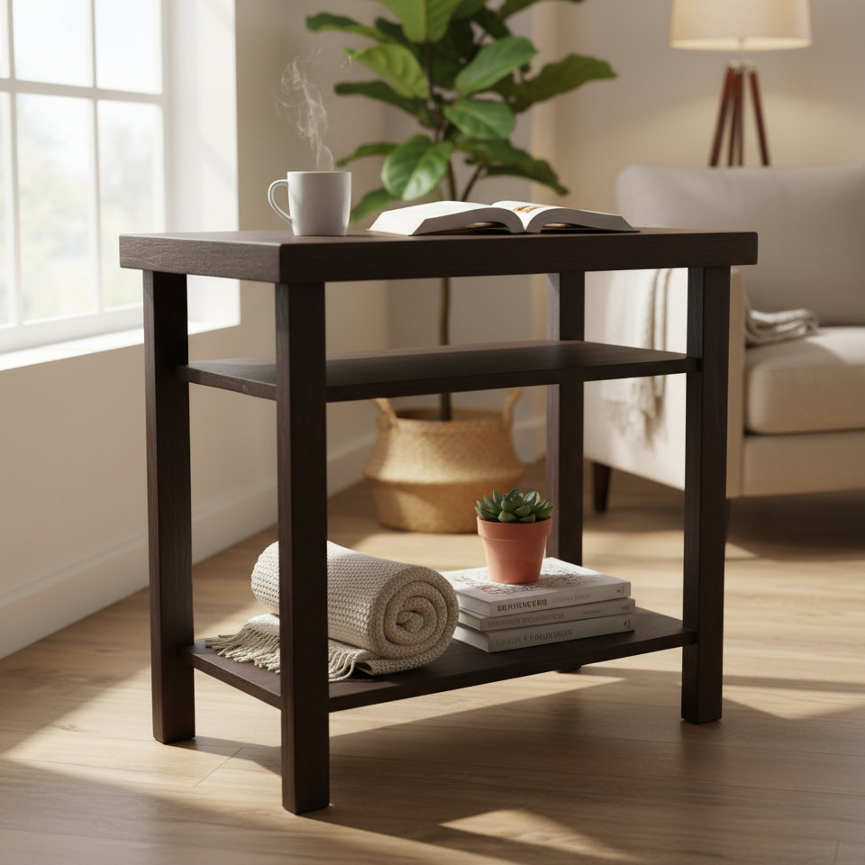 Designed to feel settled rather than showy, this table brings a sense of quiet confidence to a room. The solid wood construction gives it visual and physical weight, while the open lower shelf adds everyday utility without disrupting the overall simplicity. It works equally well beside a sofa, chair, or bed, adapting naturally to both modern and more traditional interiors.