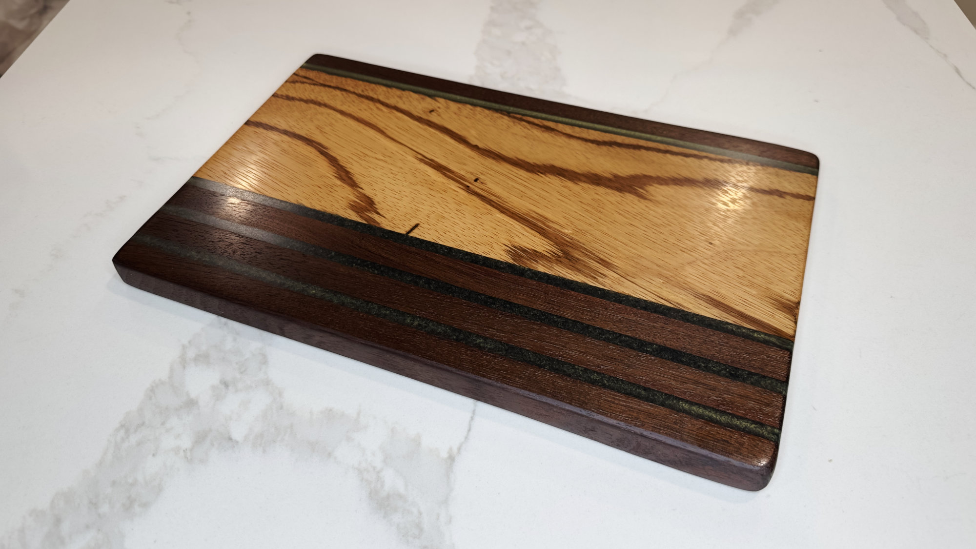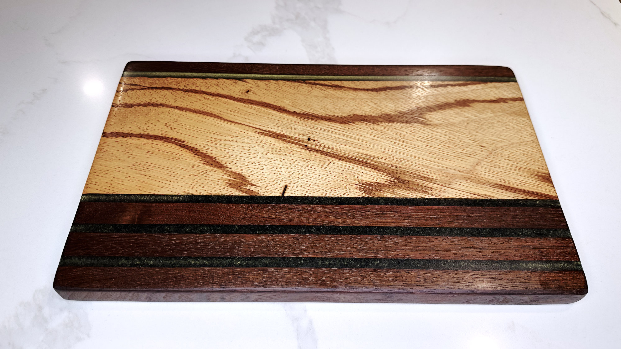 What immediately sets this piece apart is the sweeping, painterly grain of the Zebrawood. Instead of the tight striping the species usually shows, this board reveals broader, flowing lines—rare, expressive, and naturally contemporary. Deep bands of Peruvian Walnut ground the design with rich contrast, and thin Olive-Gold inlays add a subtle metallic shimmer that catches light without distracting from the wood’s character.